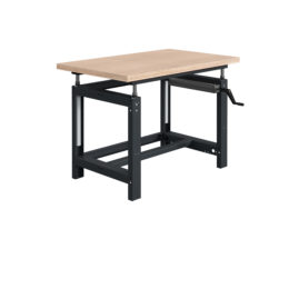 Ce système de réglage fonctionne avec un ensemble de 4 vérins hydrauliques permettant d’élever le cadre et le plateau. Les vérins sont commandés par une manivelle rabattable avec un bras de levier de 125mm. Ce principe assure une grande rigidité à l’ensemble du poste pour toutes les hauteurs. Ainsi, pour régler l'établi en hauteur, il faut tourner la manivelle dans le sens horaire. Chaque tour de manivelle monte de 5mm la hauteur de l'établi. La course de réglage s’étend de 750 à 1 020 mm pour le châssis hors épaisseur du plateau.