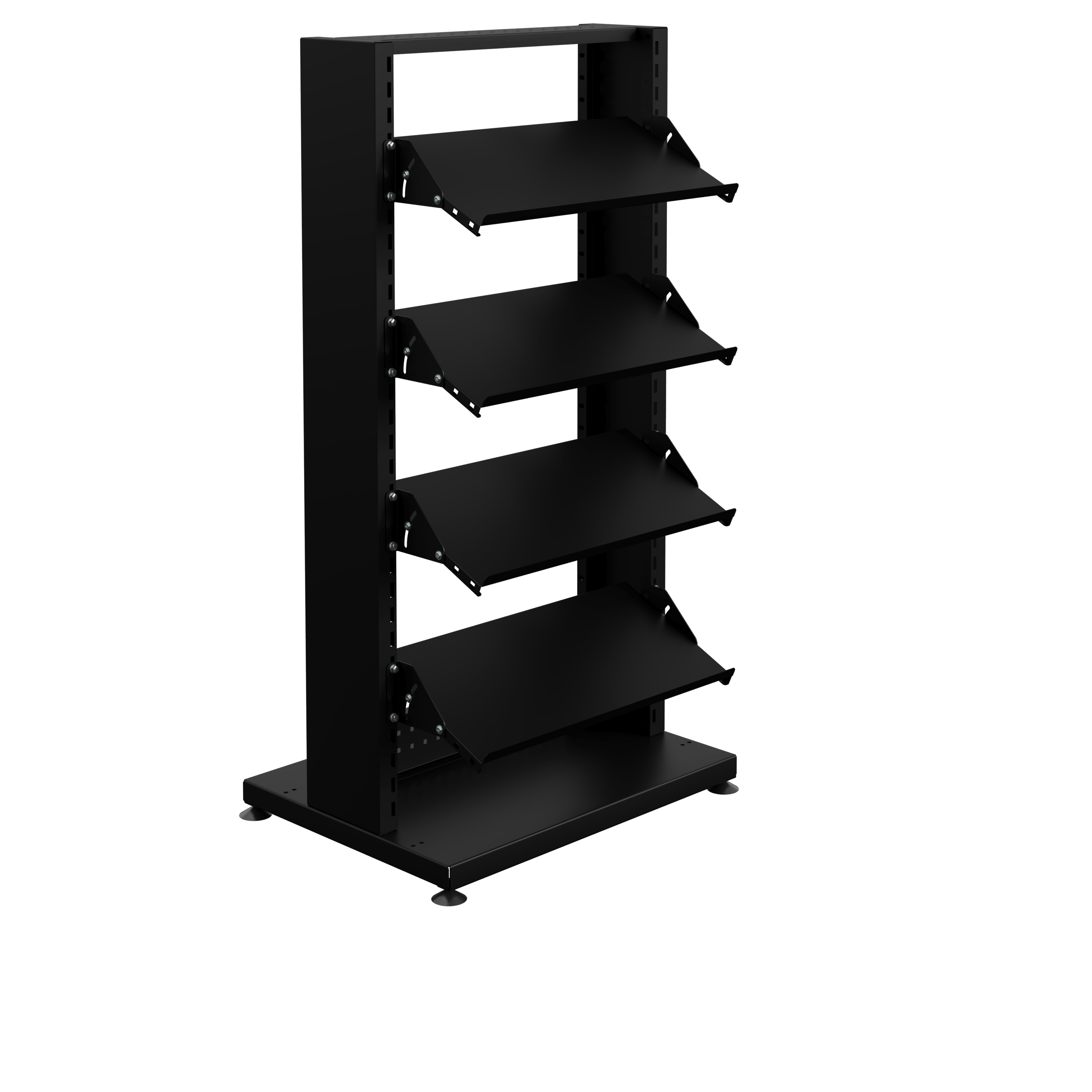 Le socle est fabriqué en tôle d’acier pliée d’une épaisseur de 25/10ème, assurant une parfaite stabilité. Les deux montants en acier (épaisseur 12/10ème) intègrent des perforations précises :